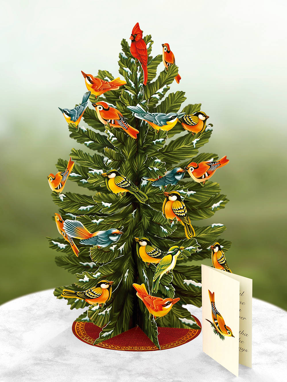 Celebrate the season with FreshCut Paper's snow-tipped balsam fir. With 36 colorful assorted birds included, you can bring the delightful landscapes of winter into your home. This pop-up tree is a great activity and tradition for your family. Create your unique tree or add birds each day of the season! The birds are very easy to attach as they all have their own slot to perch right on the tree. 10x16”